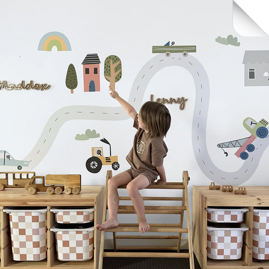 Lenny’s playroom features our Road Tripping Wall Set with Checkered Trofast Tub Decals. A personality-packed combo that makes organisation stylish and playtime even cooler.