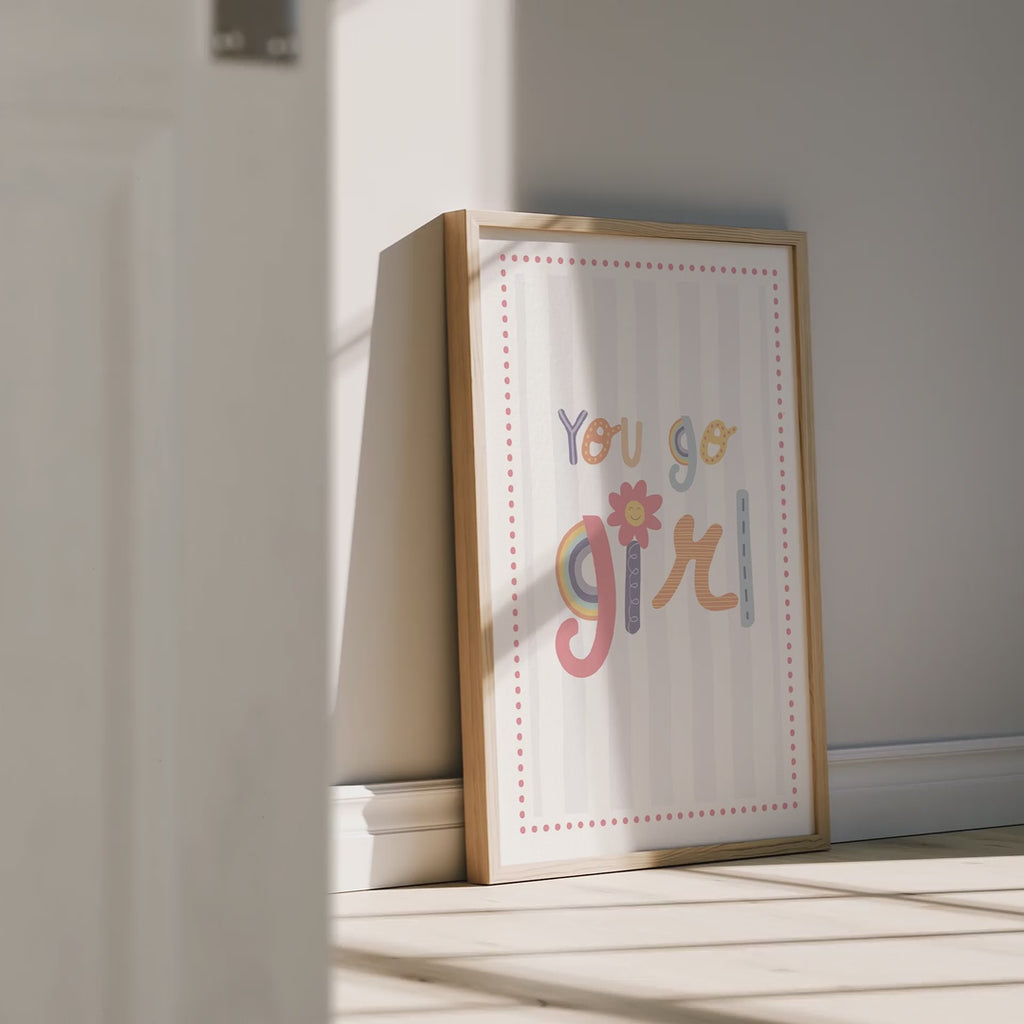 The You Go Girl Wall Print brings all the feel good girl power energy to your kids room. With its playful lettering, pastel pops, and sweet dotted frame, it adds confidence and colour to bedrooms or playrooms.