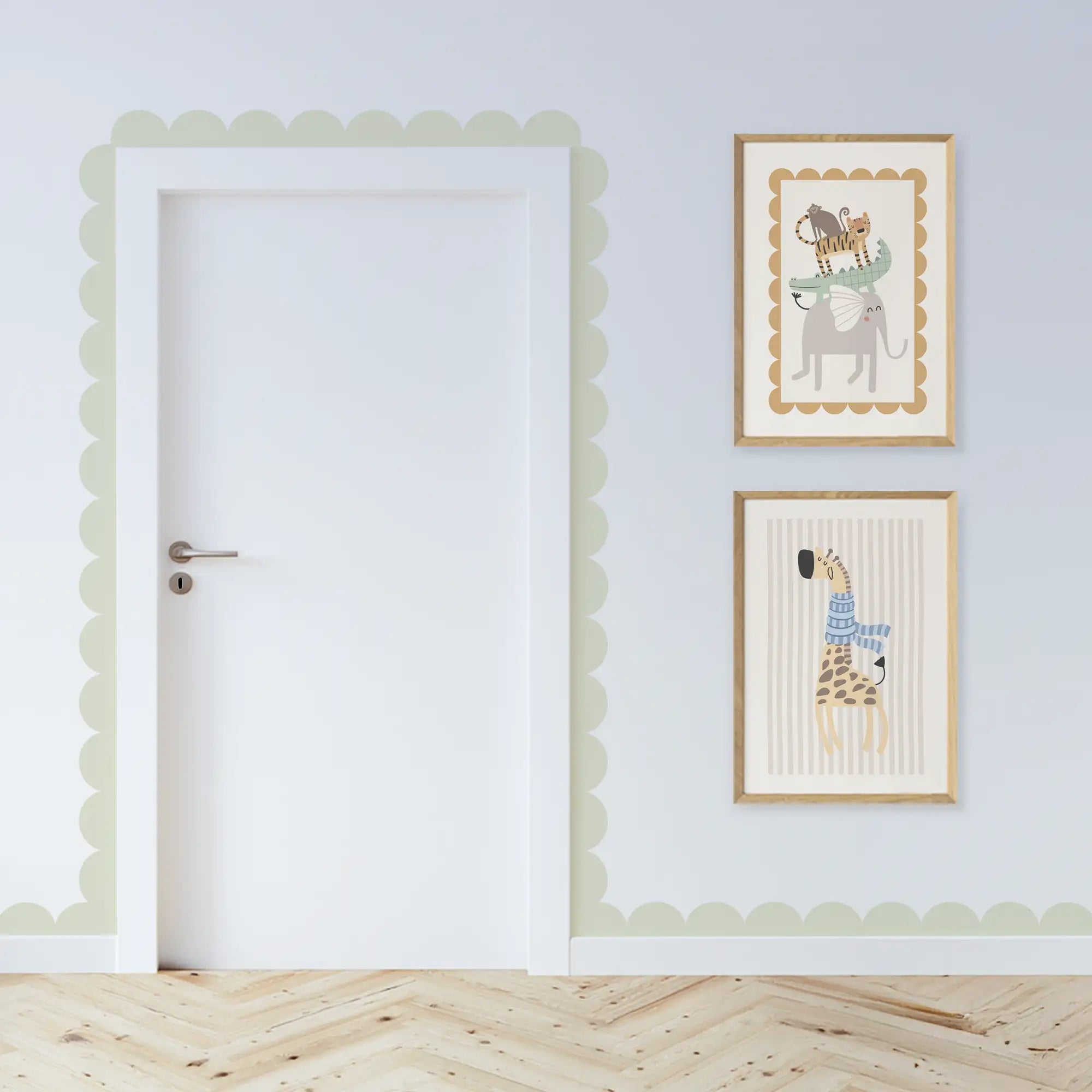 Block coloured scalloped borders paired with wall prints