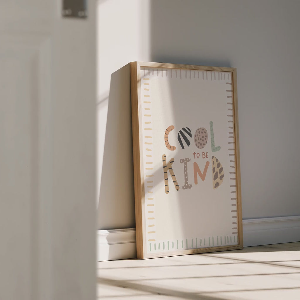 A sweet reminder for every cool kid. Cool to Be Kind adds soft colours and uplifting charm to any wall, making it the perfect feel-good print for modern kids rooms.