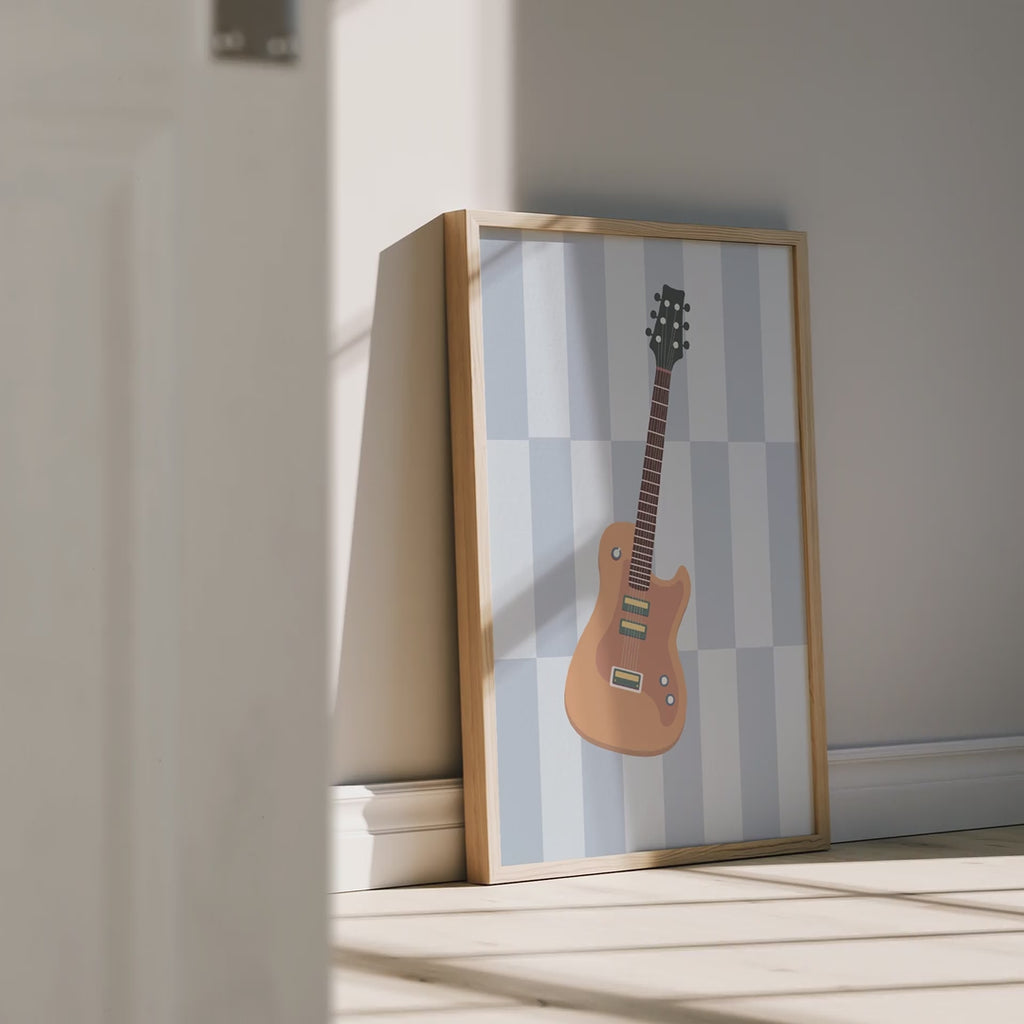 A simple, stylish guitar wall print set on a blue check background. Perfect for music-themed kids’ rooms or as part of the full Dino’s Rock collection.