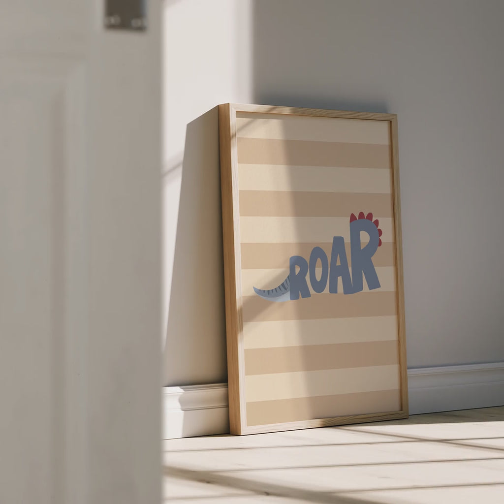 Make a statement with the ROAR wall print. Blue and beige stripes meet dino energy for a fun, modern take on boys’ wall art and playroom decor.