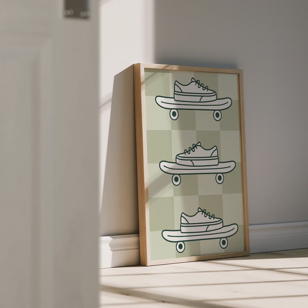 Three boards, sneakers, endless cool. This skateboard inspired print brings the street style vibe home, ideal for mixing with panels or other Skater Gator prints.